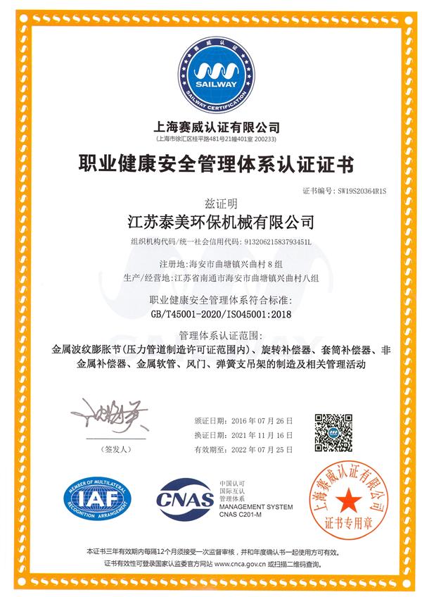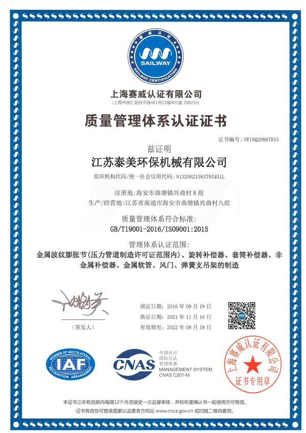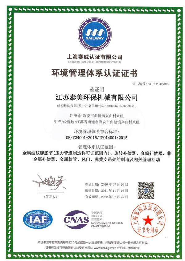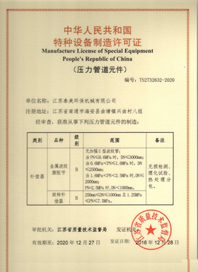 江蘇泰美環保機械有限公司(si)專業生產(chan)金屬波(bo)紋(wen)管(guan)(guan)膨脹節、不銹鋼金屬軟管(guan)(guan)、非金屬耐高溫(wen)織物補償(chang)器、脫硫擋板(ban)門、彈簧(huang)支吊架、環保機械、水泥機械、建材機械等產(chan)品,是目(mu)前國內(nei)規(gui)模較大(da)的自主研制和技(ji)術開發能(neng)力的現代化企(qi)業。